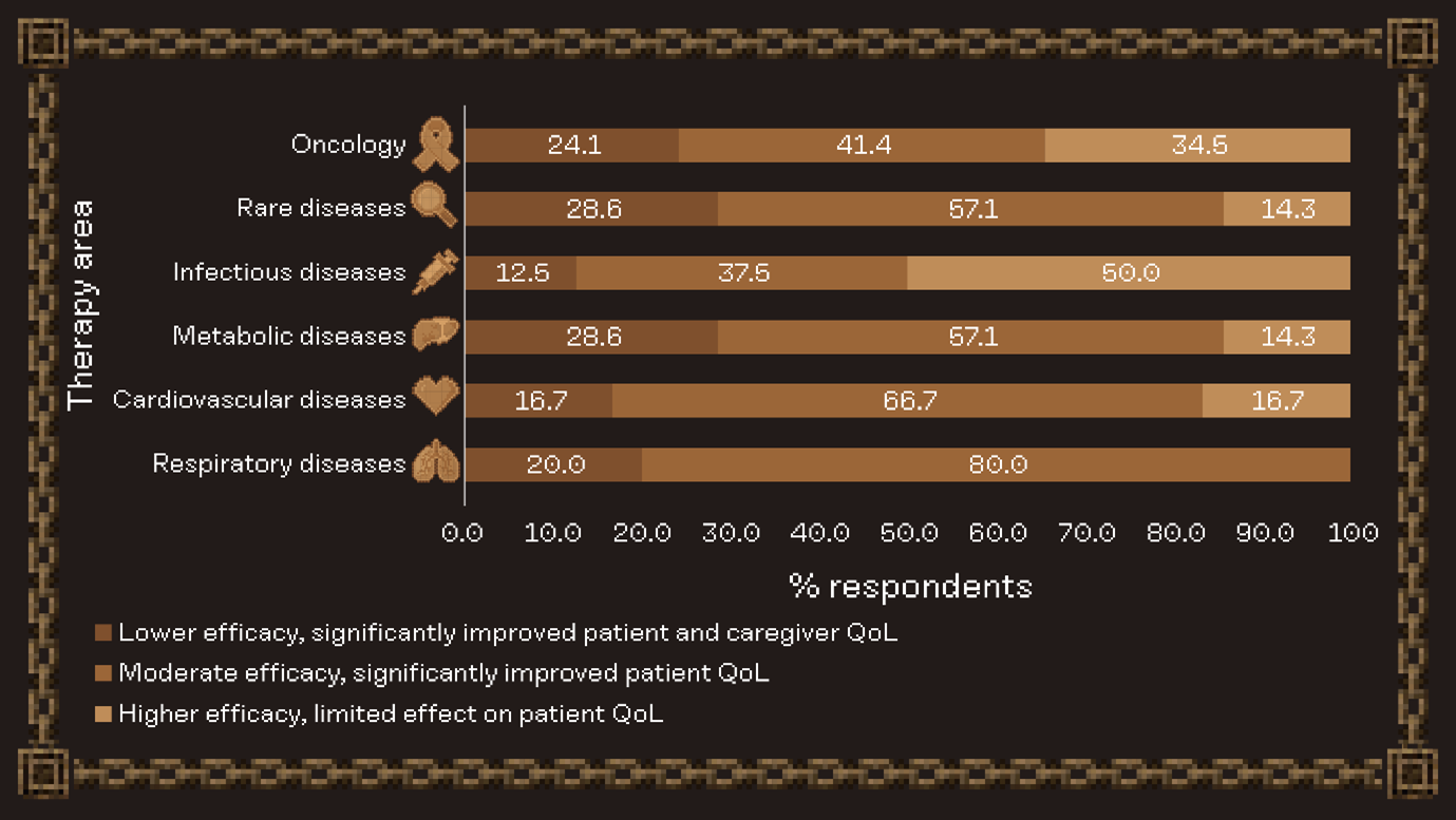Respondents valued therapies that deliver meaningful improvements in QoL, even when efficacy gains were modest. This is especially relevant for cardiovascular and respiratory diseases, reflecting stakeholder focus on holistic outcomes for chronic conditions. Oncology and infectious diseases had the highest percentage of respondents prioritizing higher efficacy, indicating continued emphasis on survival and disease eradication in high-burden therapy areas.