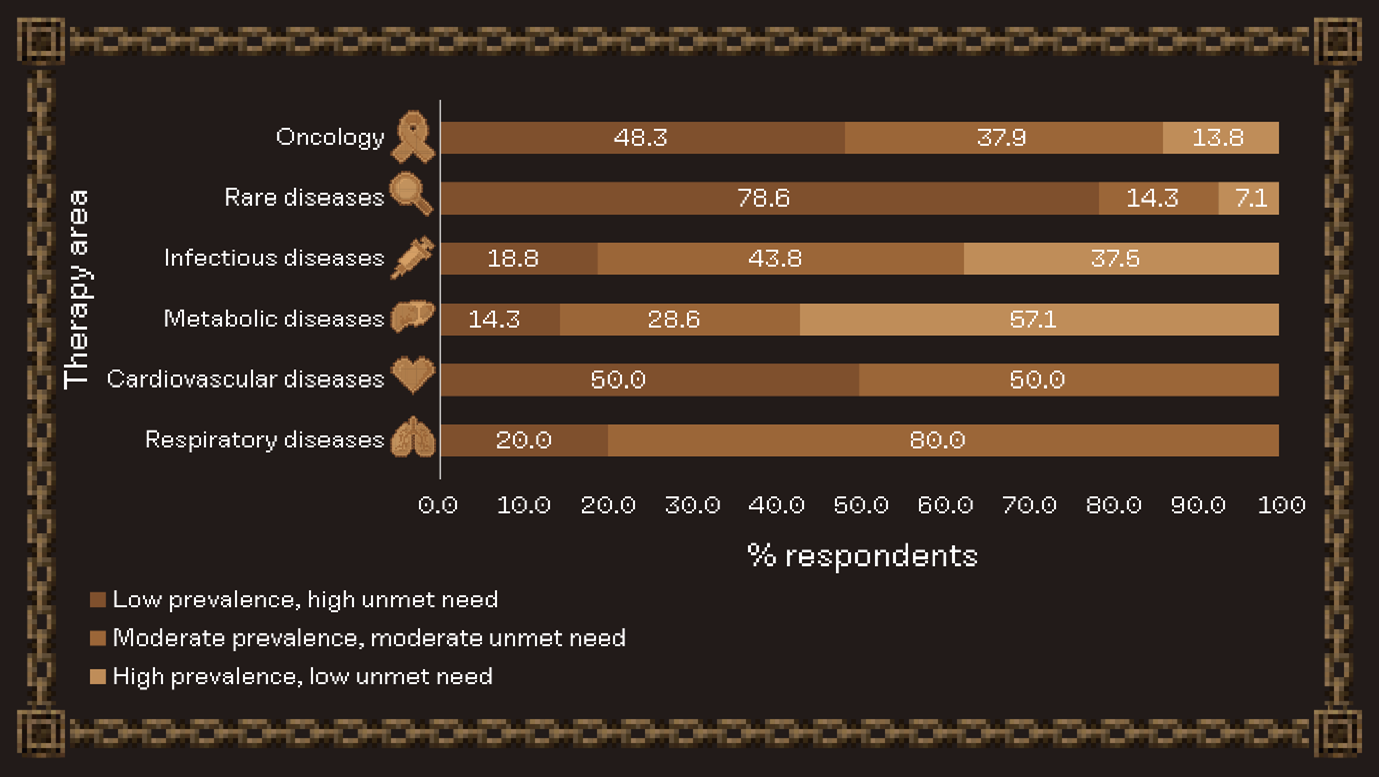 Our respondents opted for “low prevalence, high unmet need” when asked which area they would prioritize, aligning with rare disease being one of the most popular disease areas. This may also reflect trends in personalized medicine with increasingly small patient populations.