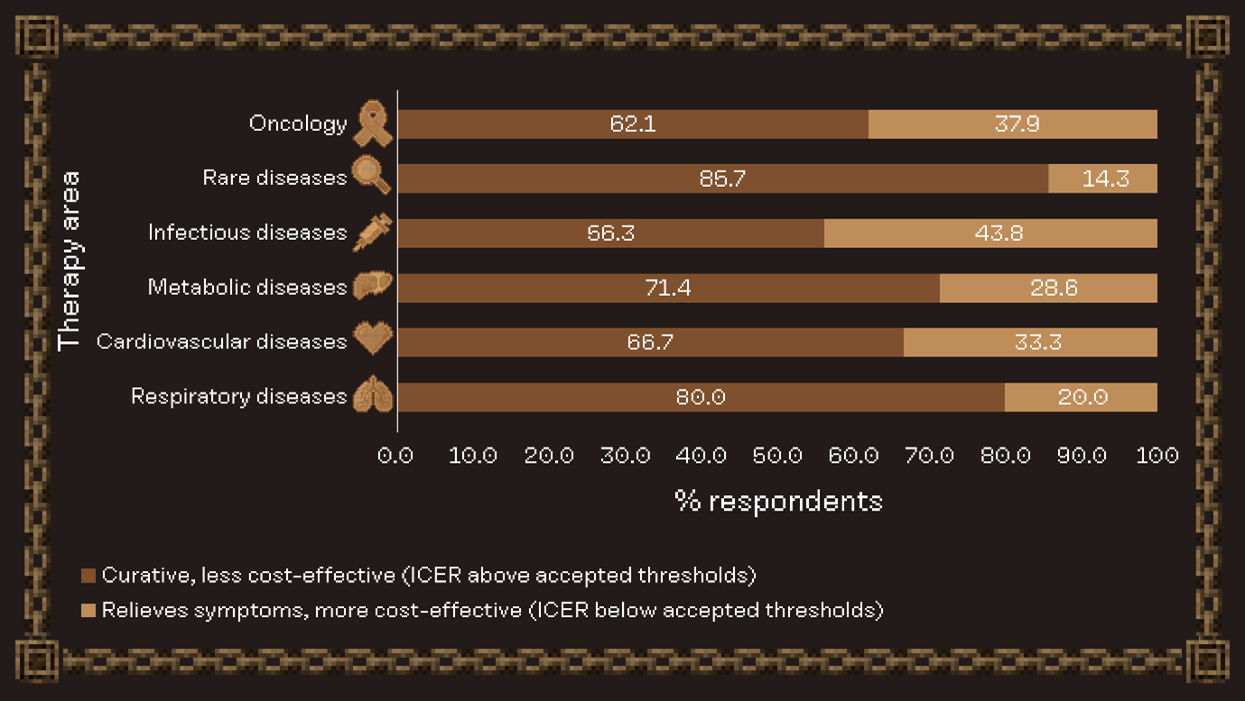 Stakeholder willingness to accept higher cost-effectiveness thresholds depended heavily on therapeutic context. In rare diseases, respondents prioritized curative treatments even when ICERs exceeded accepted limits, aligning with higher payer flexibility on ICERs when unmet need is high. Conversely, in infectious diseases, cardiovascular diseases and oncology settings, preferences leant towards cost-effective symptom relief, reflecting tighter scrutiny on cost-effectiveness.