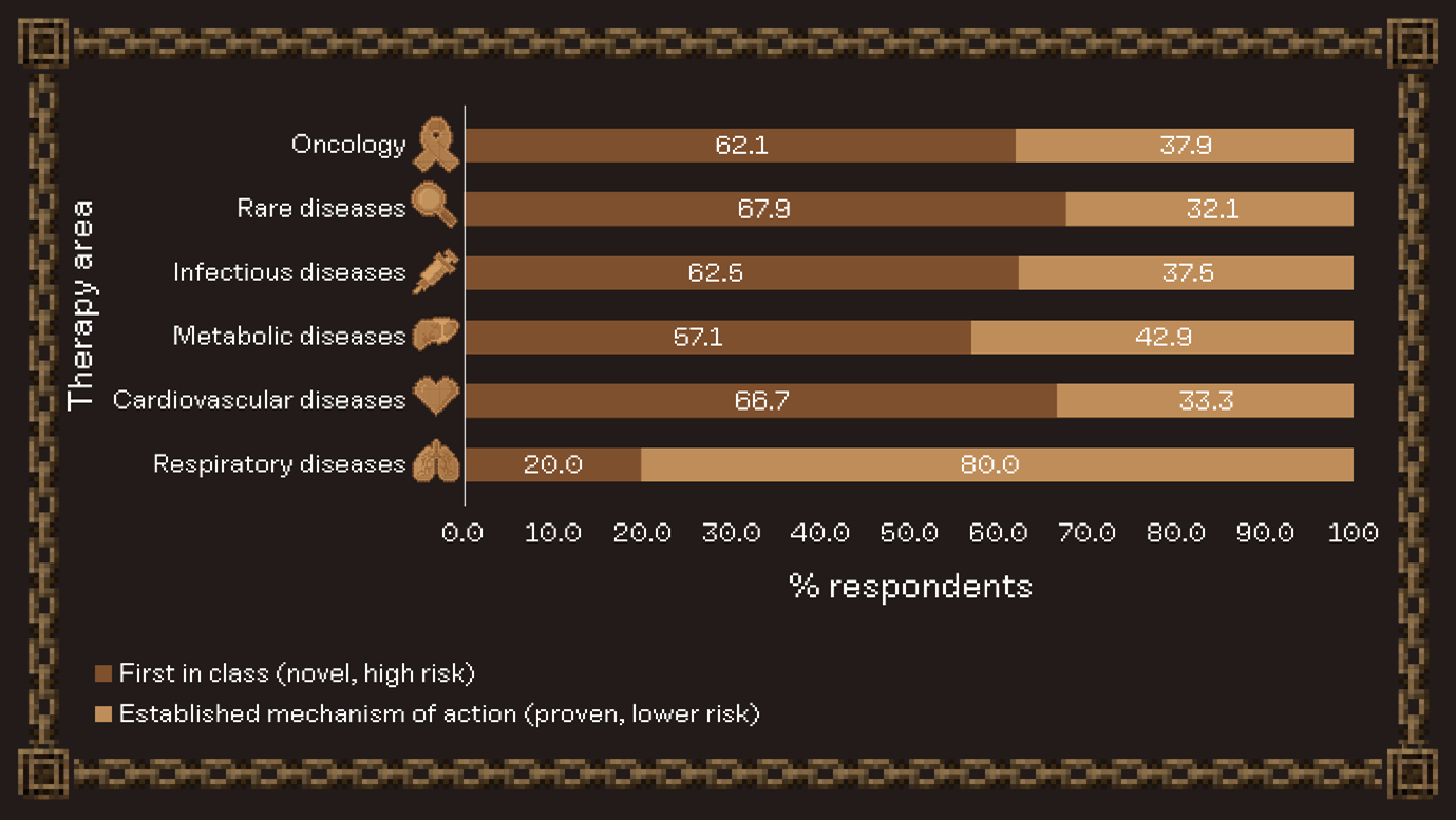 Summary of responses to the question, “Would you prefer a first-in-class product offering higher risk or an established mechanism with lower risk potential?”